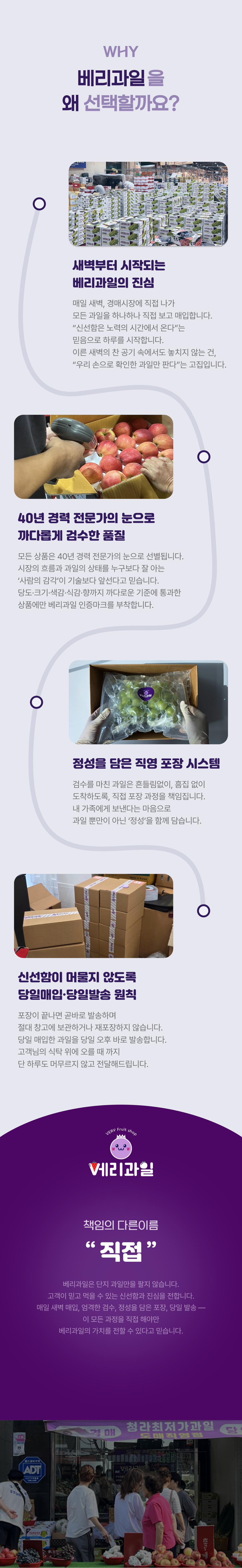 인공 착색 없이 자연숙성으로 완숙된 과실만 선별. 미세한 흠이 있어도 맛과 품질은 변함없습니다.